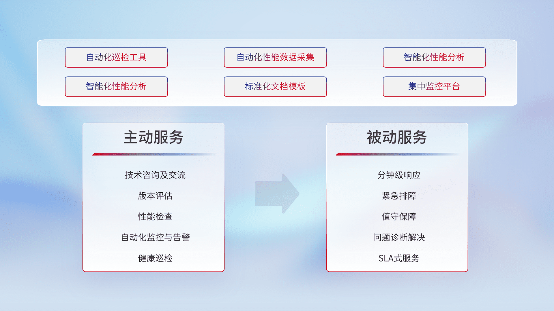 智能化工具和标准化文档,,,保障服务质量,,,提供主动服务(包含技术咨询、、、版本评估、、、、性能检查、、、、自动化监控与告警、、、、健康巡检)和被动服务包含(分钟级响应、、紧急排障、、、值守保障、、、问题诊断解决、、、SLA服务)。。。