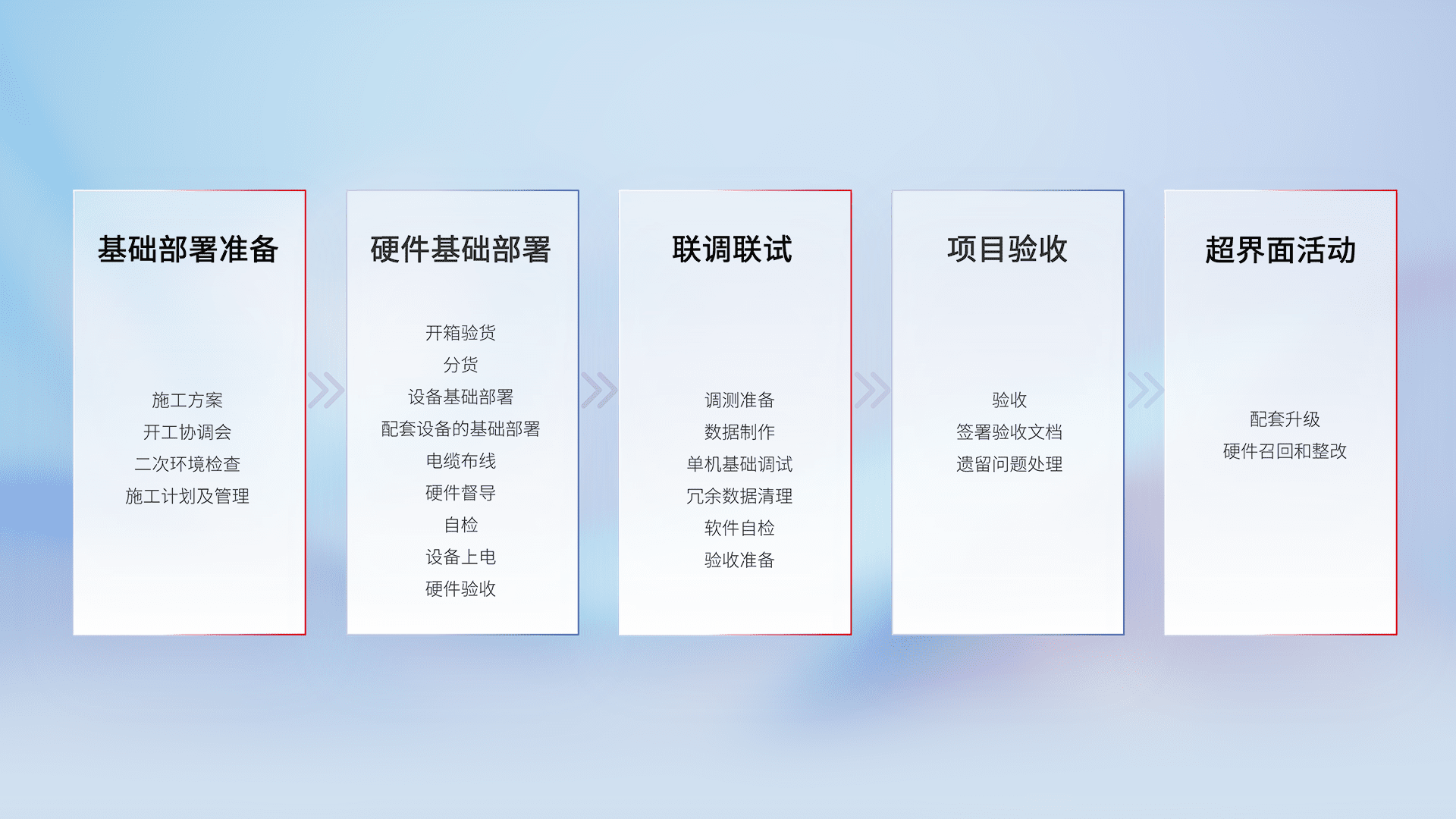 从基础部署准备、、、硬件基础部署、、、、联调联试、、、、项目验收、、越界面活动的全过程可追溯,,,保证施工质量和进度。。。